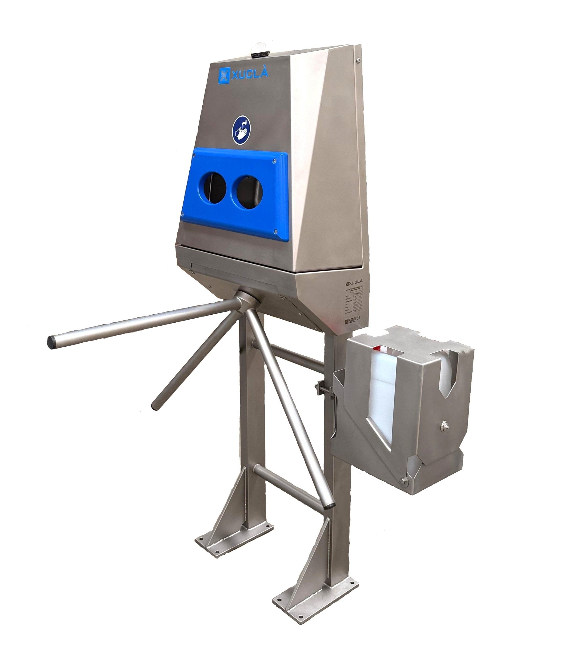 Al introduïr ambdues mans es produeix una pulverització temporitzada de líquid esterilitzant i ens permet el pas través de la barrera.